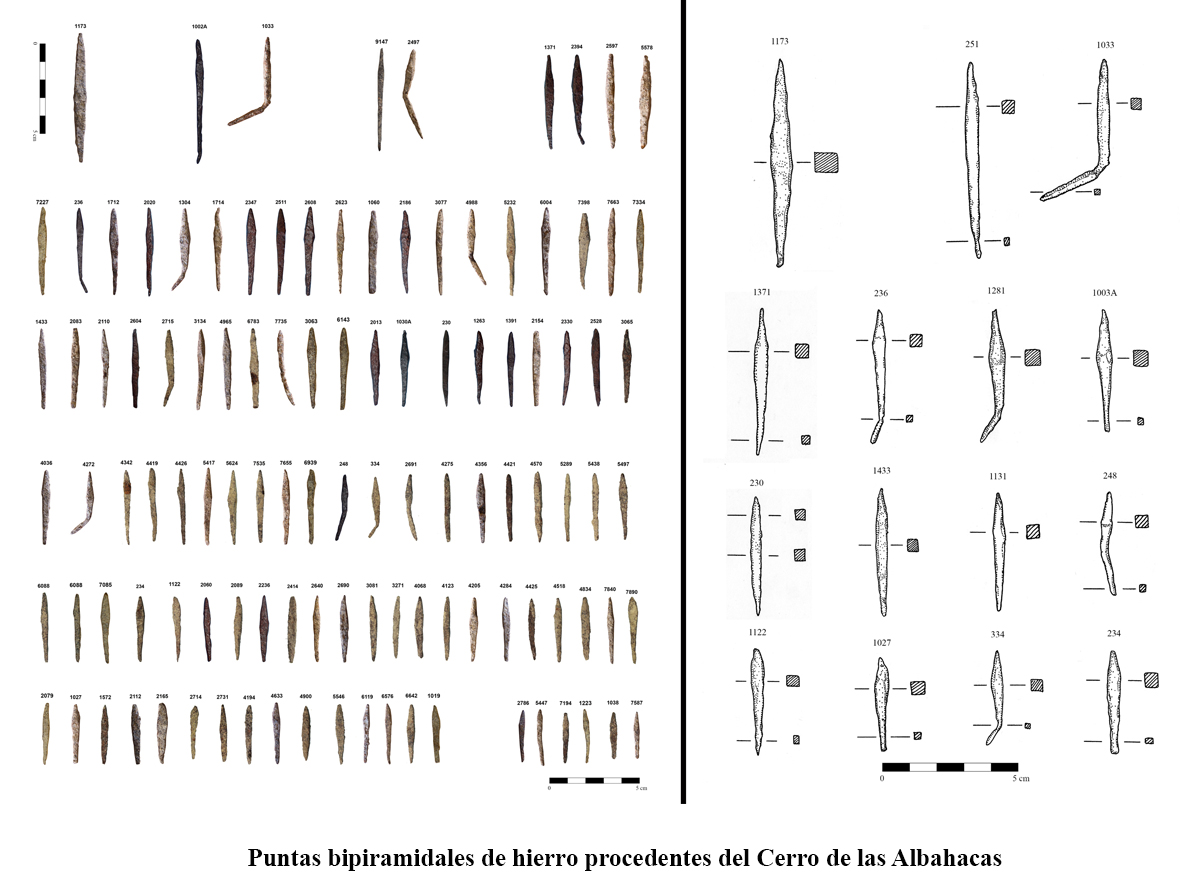 Otro tipo de armas arrojadizas son las definidas como tela, en el que se incluyen un corpus relativamente amplio y heterogéneo de pequeñas armas de astil, consistente con los tipos con una fecha de entre fines del s. III y principios del s. I a.C., y está próximo tanto a materiales locales como a los lotes de armas llamadas ‘romanas republicanas’ conocidos característicos de la República. Documentamos varios ejemplares de pequeñas jabalinas se sección circular y nervio destacado. También un pequeño grupo de piezas de uso mixto, que pudieron usarse como lanzas empuñadas o como jabalinas, aunque su tamaño reducido nos hace decantarnos por este último uso. Morfológicamente se caracterizan por una sección aplanada sin nervio ni arista. Asimismo contamos con algún ejemplar de moharra de lanza (hastae), que recoge un modelo frecuente en contextos militares romanos. Paralelamente se han documentado hasta una docena de regatones, es decir, un tipo de piezas cónicas con cubo para embutir un astil de madera. Son objetos con función múltiple, hincar la lanza en el suelo en campamento, proteger el extremo inferior de golpes, rematar a los heridos enemigos,… Todas las piezas de Las Albahacas son del tipo de cubo hueco y forma cónica.